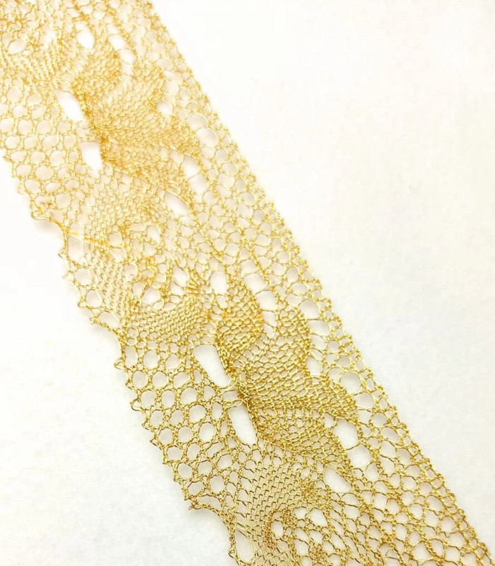 Esta puntilla destaca por su acabado metalizado de gran calidad, que brinda un toque luminoso y refinado.